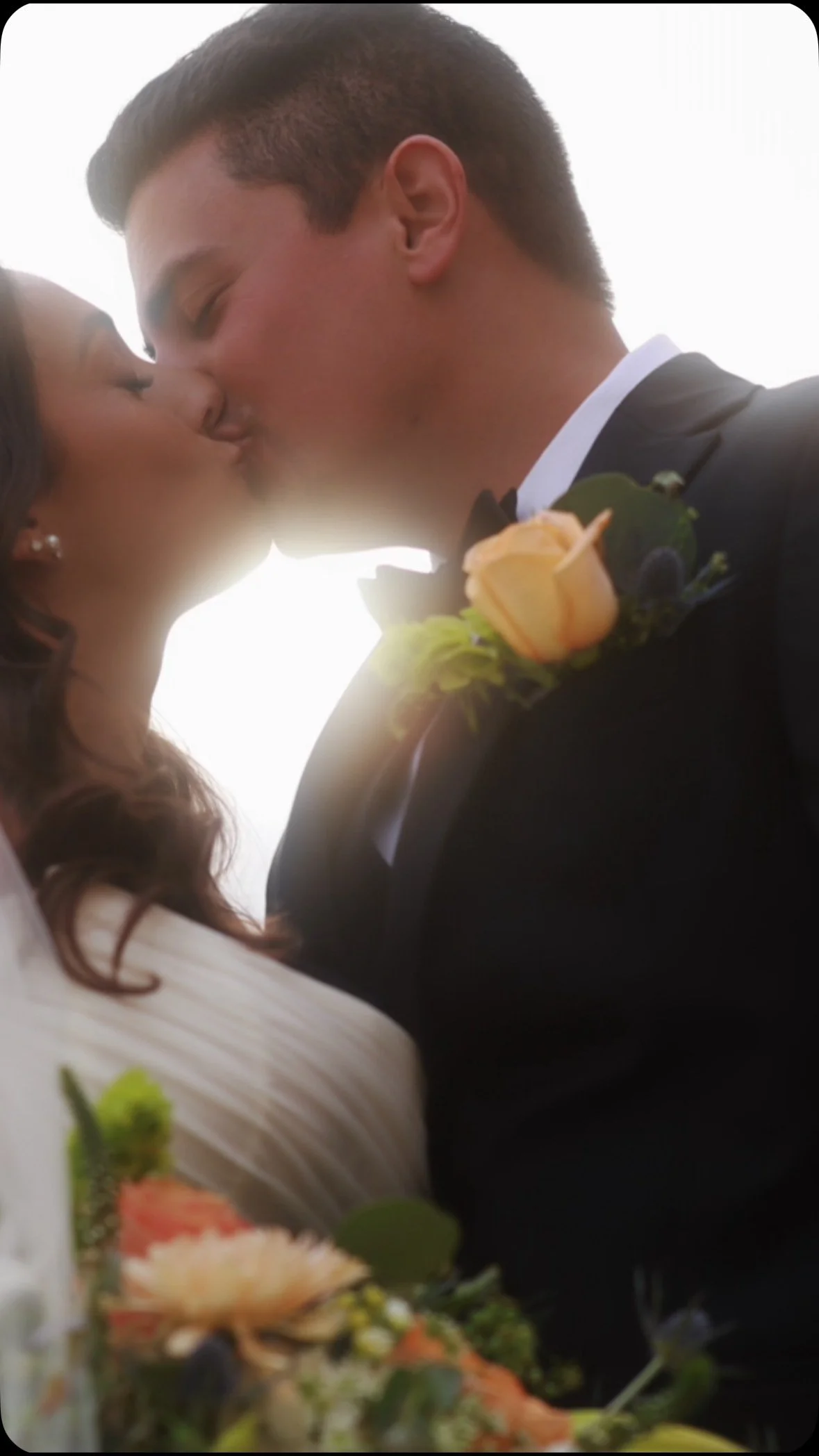 A man and woman standing outdoors, with the woman holding a bouquet of pink flowers. The man is wearing sunglasses, a light blue button-up shirt, and dark jeans. The woman is wearing a white dress with thin straps, has wavy brown hair, and is wearing