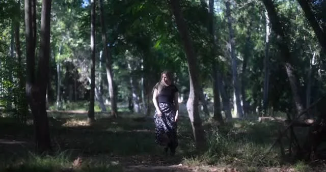 A woman with long dark hair wearing a black t-shirt and blue jeans standing outdoors with her hands on her hips, surrounded by bushes and trees with some red flowers, under a partly cloudy sky.