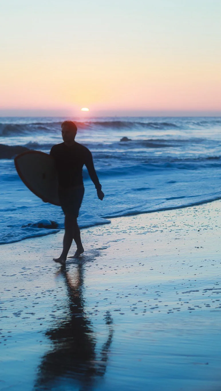 A smiling woman with glasses and long hair standing on a sandy beach at sunset, wearing a Raiders jacket and ripped jeans.